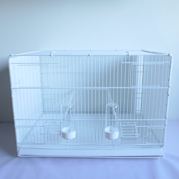Deze draadkooi is eenvoudig in elkaar te zetten. De zijwanden zijn van wit kunststof. De draadkooi heeft een afmeting van 60 cm. Wordt compleet geleverd met zitstokjes, blauwe bakjes en blauwe fonteintjes.